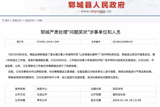 1月24日,鄆城縣人民政府網(wǎng)站發(fā)布通報(bào),通報(bào)全文如下: