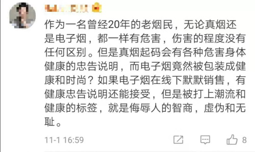 有網(wǎng)友指出,電子煙在線下默默銷售,有健康忠告說明還能接受,但是被打上潮流和健康的標(biāo)簽,就是侮辱人的智商。